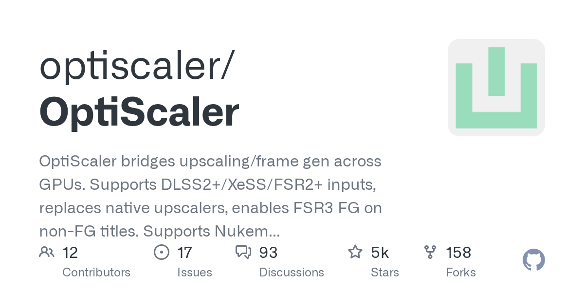 OptiScaler bridges upscaling/frame gen across GPUs. Supports DLSS2+/XeSS/FSR2+ inputs, replaces native upscalers, enables FSR3 FG on non-FG titles. Supports…
