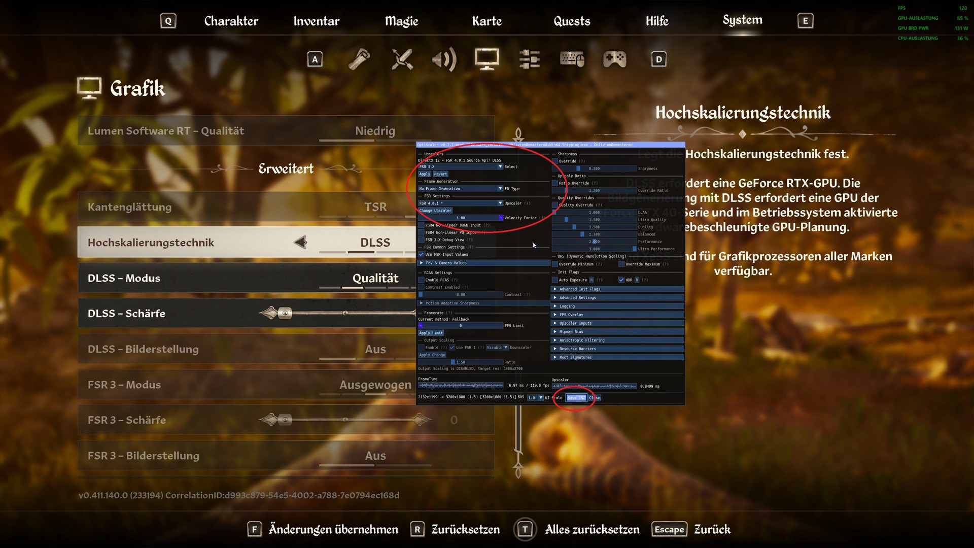 Mit "Einfg" Taste öffnet sich das Menü vom OptiScaler und kann auf der Linken Seite auf FSR4 umschalten.