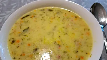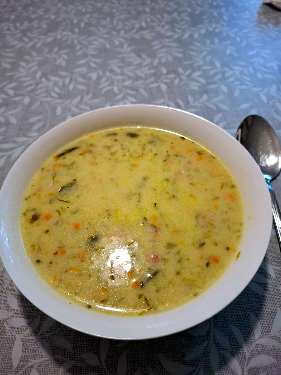 1 Becher Sahne Salz, Pfeffer, ca. 3 Liter Brühe, 2 Würfel Fette Brühe, Dill Suppe mit etwas Mehl andicken