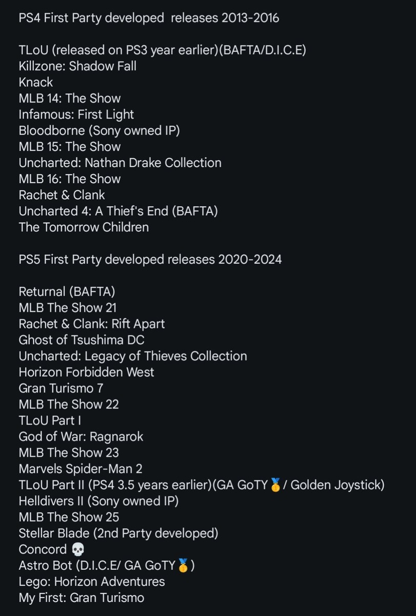 Wo war die PS4 Gen nun in irgendwas überlegen, wenn man die Zeiträume vergleicht? Ja, in der Liste wird ein kürzerer Zeitraum verglichen, deswegen würde ich für 2017 auch noch ein HZD mit einfügen. Aber das macht das Kraut nicht wirklich fett und Corona ist ein gegebener Faktor Industrie übergreifend. Ich sehe es einfach keinen objektiv viel bessere PS4 Gen aktuell zur PS5 im selben Zeitraum... bitte zeigt es mir auf, wo das sein soll?^^ Wenn man streng ist, kann man doch sogar das hoch gelobte Bloodborne von 2015 streichen, denn das hat FromSoftware entwickelt, und kein Sony Studio - dann nehme man auch Stellar Blade weg