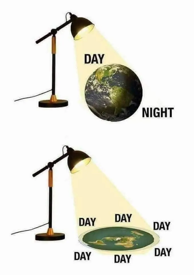 Ihr versteht den Meme eindeutig falsch. NatĂŒrlich ist die Erde flach. Aber die Sonne ist auch flach und jeden Tag dreht sich die Erde, wie eine MĂŒnze, dann ist es dunkel.^^