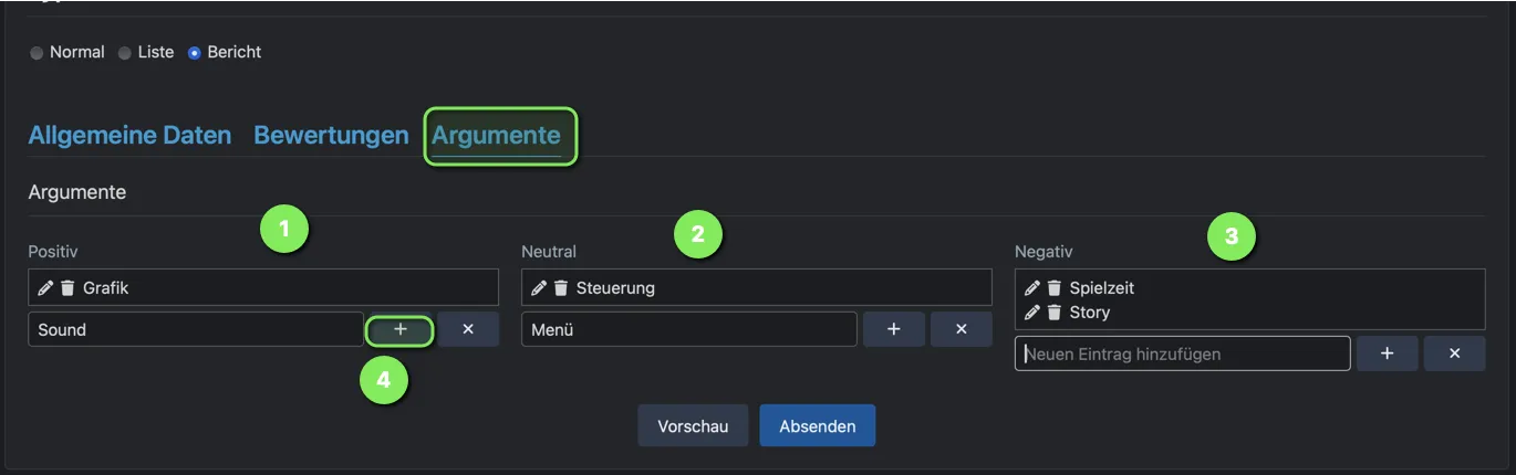 4. Über das Plus könnt ihr bei den jeweiligen Argumente weitere hinzufügen. mIt dem X könnt ihr dies wieder löschen!