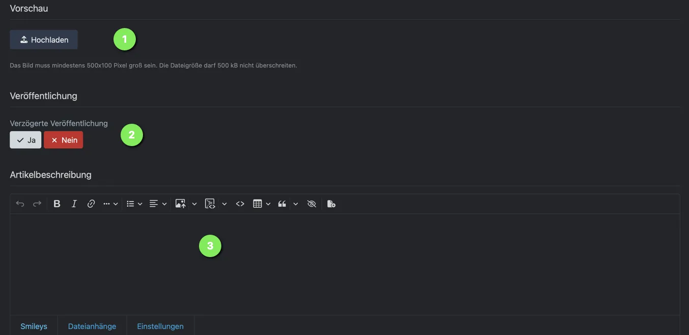 2. Veröffentlichung verzögern JA/Nein! Wenn Ihr Ja wählt könnt Ihr Datum und Uhrzeit wählen, bei NEIN wird er danach gleich veröffentlicht!