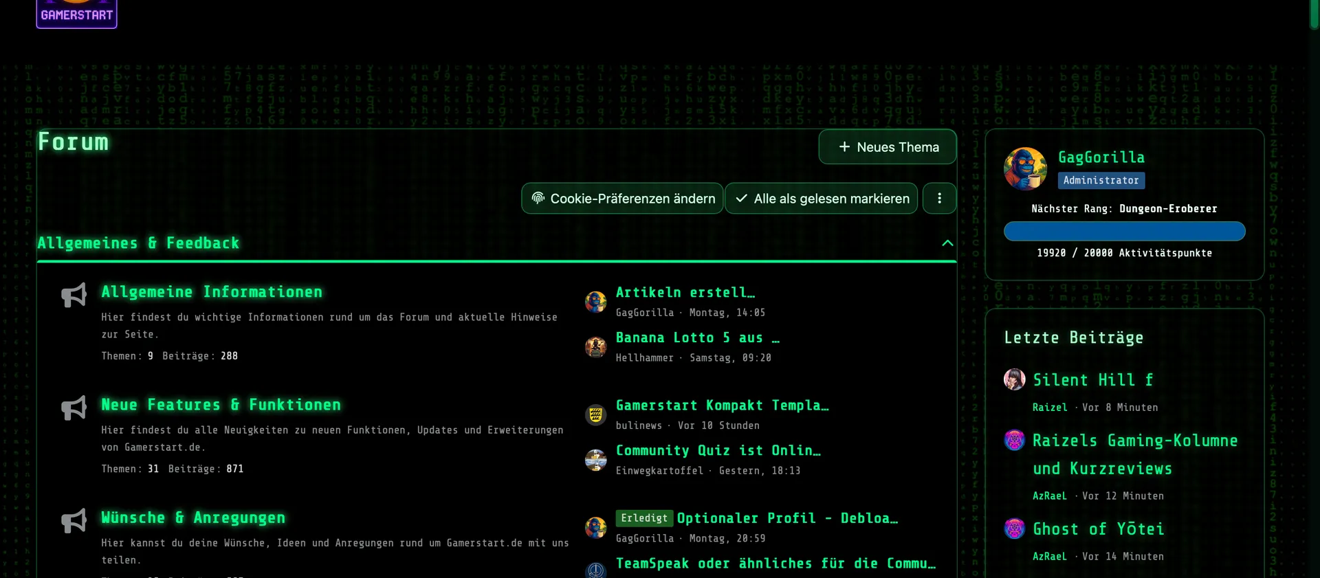 heute ist das Matrix-Template bei uns eingezogen – auf Wunsch von Azrael! Ich habe die Farben, Schriften und Designelemente so angepasst, dass der Look nah am Original bleibt, aber trotzdem gut in unsere Umgebung passt.