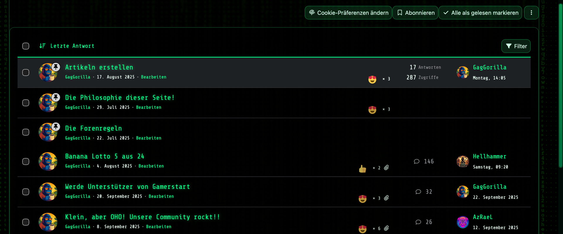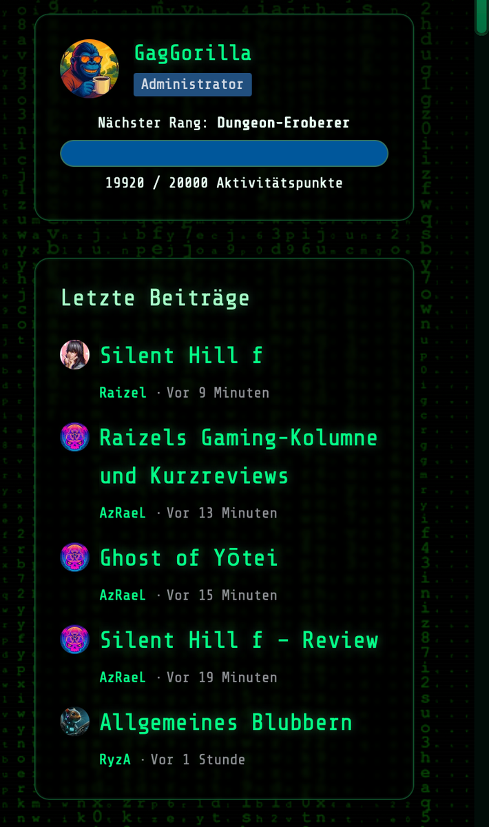 heute ist das Matrix-Template bei uns eingezogen – auf Wunsch von Azrael! Ich habe die Farben, Schriften und Designelemente so angepasst, dass der Look nah am Original bleibt, aber trotzdem gut in unsere Umgebung passt.