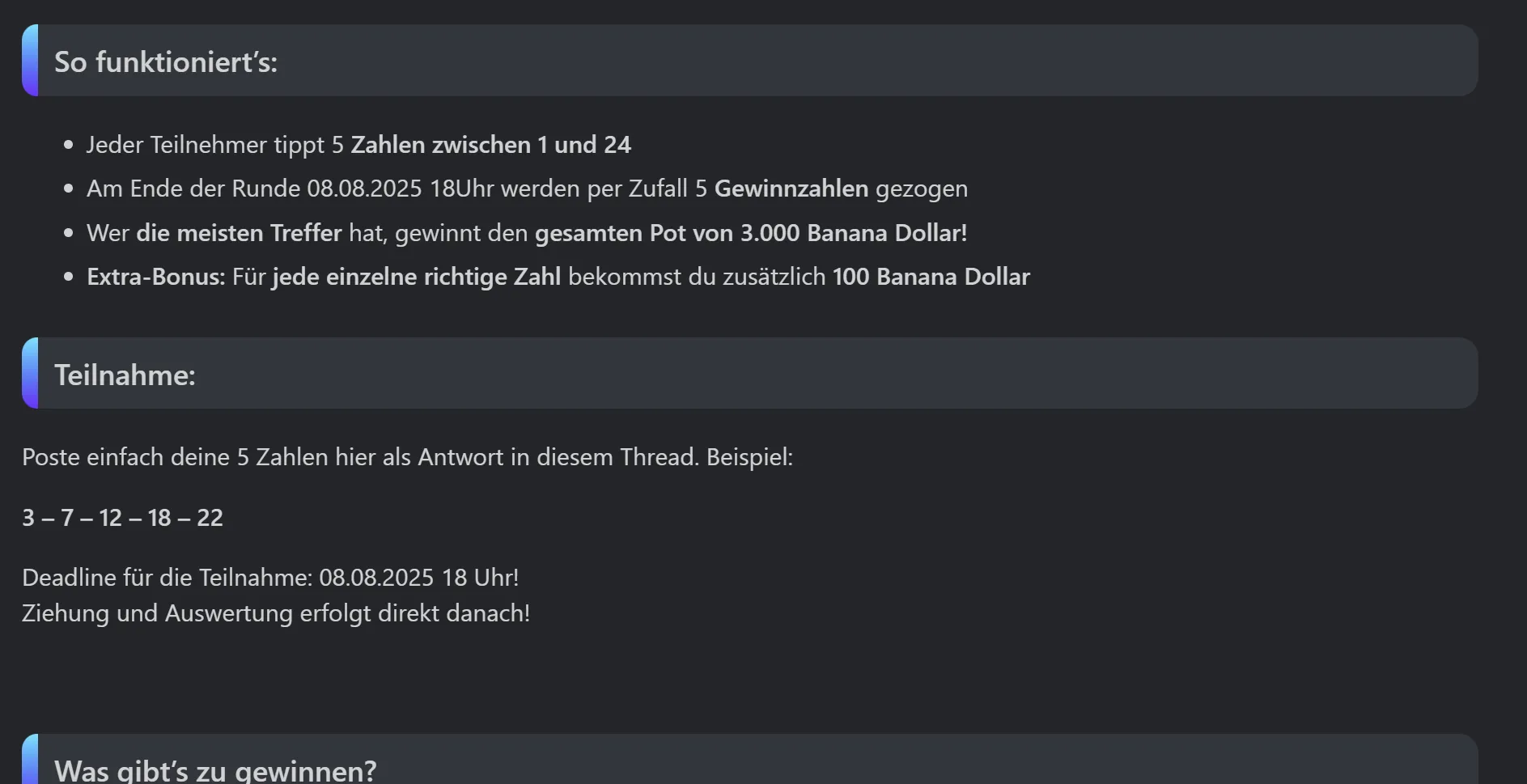 Banana Lotto steht wieder an! Am 05.09.2025 um ca. 10 Uhr Vormittag werden die Zahlen wieder gezogen! Die Spieleregeln sind bekannt!